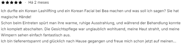 Ich durfte ein korean lifting und korean facial bei Bea mache und was soll ich sagen? sie hat magische Hände! Schon beim Eintreffen spürt man ihre wärme, ruhige Ausstrahlung uind während der Behandlung konnte ich komplett abschalten. Die Gesichtspflege war unglaublich wohltuend.