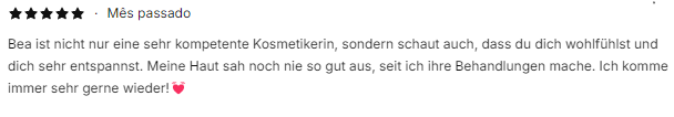 Bea ist nicht nur eine kompetente Kosmetikerin, sondern schaut auch, dass du dich wohlfühlst und dich sehr entspannst. Meine Haut sah noch nie so gut aus, seit ich ihre Behandlungen mache. Ich komme sehr gerne wieder!