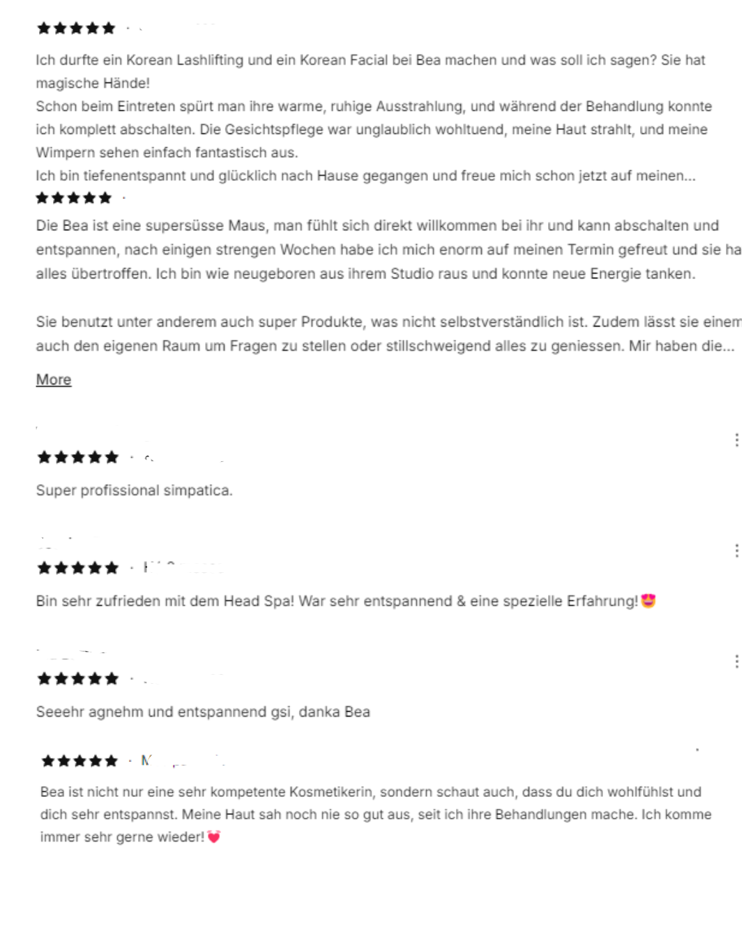 1. Hautanalyse mit modernster KI-Technologie Zum Start führe ich eine ausführliche Hautanalyse durch. Mithilfe von KI werden deine Hautmerkmale präzise ausgewertet und in Prozentzahlen dargestellt – so erhältst du ein klares Bild über Feuchtigkeit, Elastizität, Porengröße und andere wichtige Faktoren. 2. Individuelle Behandlungsempfehlung Auf Basis der Analyse empfehle ich dir zwei geeignete Behandlungsalternativen und erstelle ein persönliches Behandlungsprotokoll, das genau auf deine Hautbedürfnisse abgestimmt ist. 3. Ganzheitliche Hautpflege Da rund 80 % des Erfolgs von deiner täglichen Routine abhängen, gebe ich dir Produktempfehlungen mit, die deine Haut zuhause optimal unterstützen. So werden die Ergebnisse der Behandlung beschleunigt und langfristig stabilisiert.